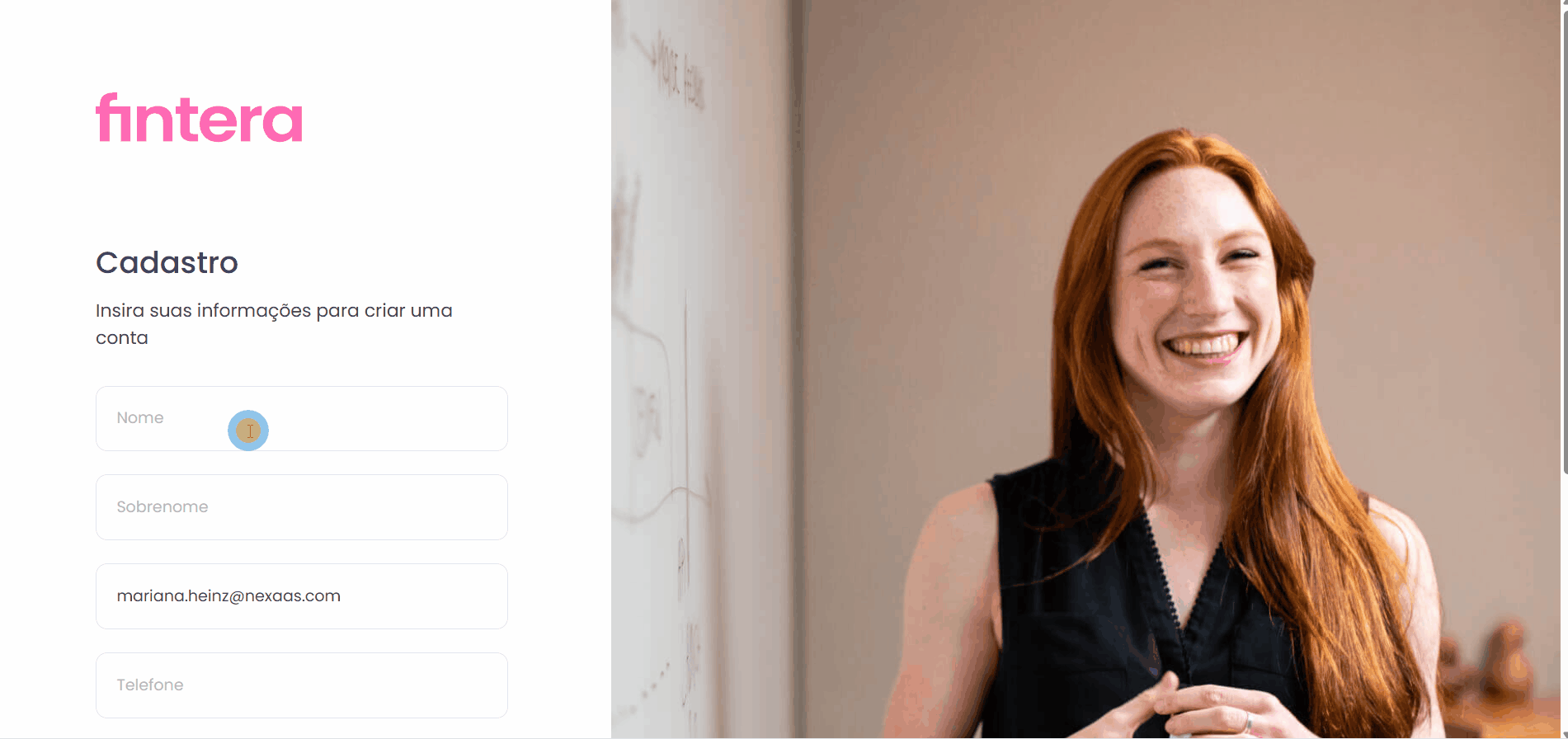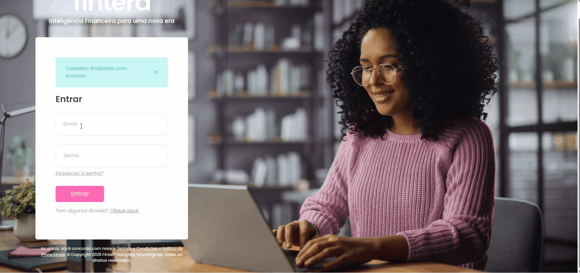 Com o cadastro concluído, você será redirecionado para a tela de login da Fintera.