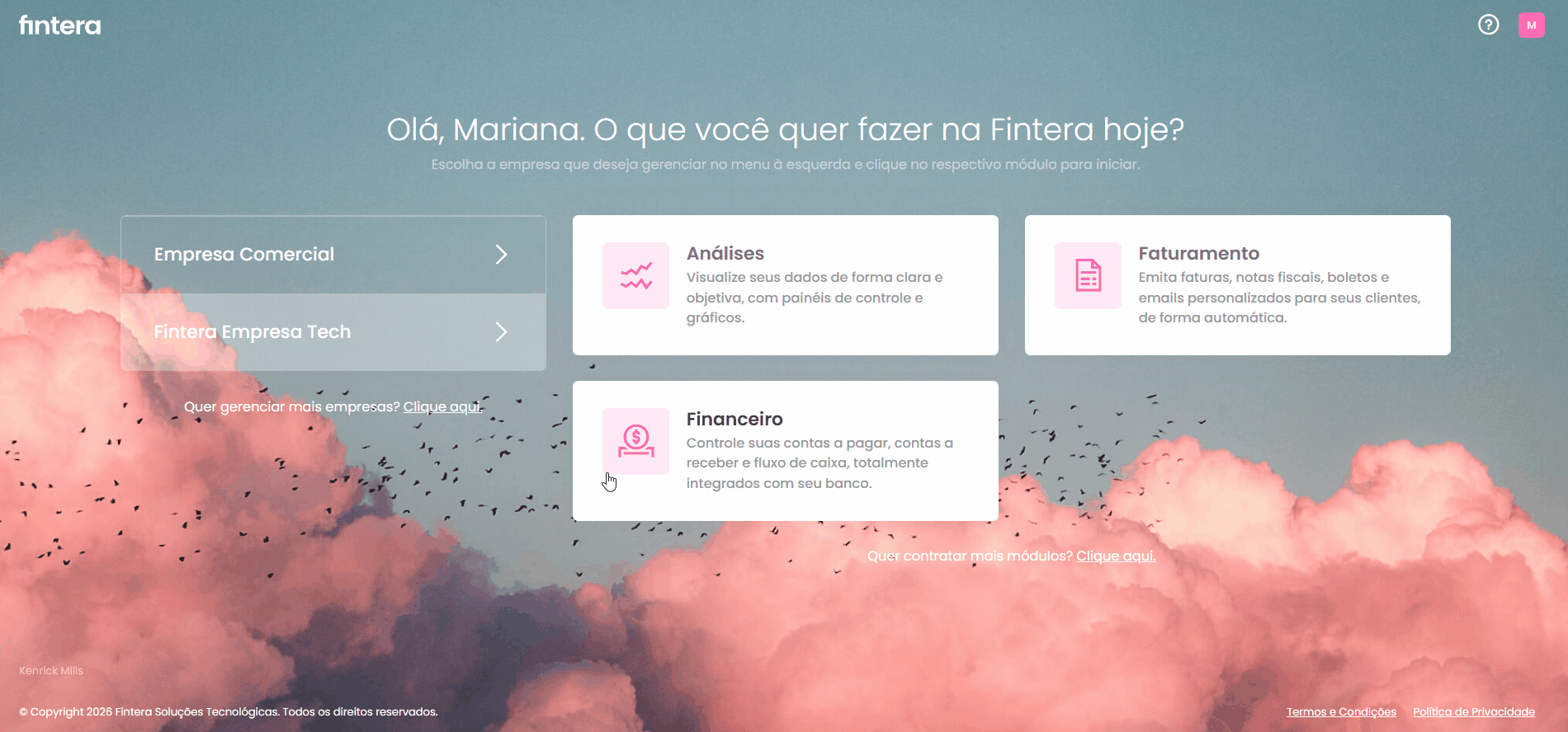 É o seu ambiente de acesso principal. Nele, você visualiza todas as empresas vinculadas e os módulos ativos (como Faturamento e/ou Financeiro). 💡 Lembre-se: o que cada usuário consegue ver depende das permissões específicas concedidas a ele em cada empresa e módulo. |