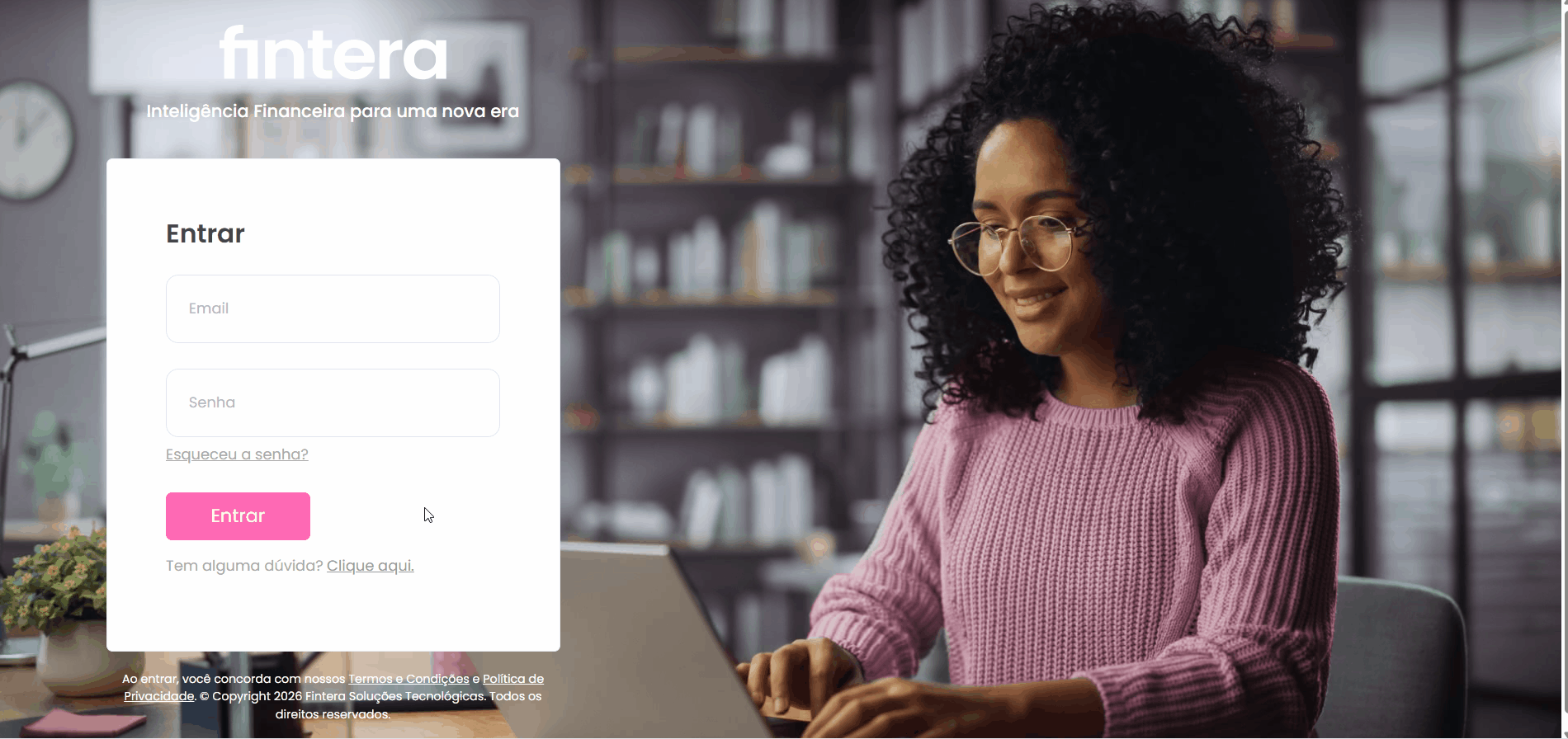 Acesse a página de login através do endereço conta.fintera.com.br. Logo abaixo do campo de senha, clique no link Esqueceu a senha?. Na tela seguinte, digite o e-mail que você utiliza para acessar o sistema e clique no botão Enviar: