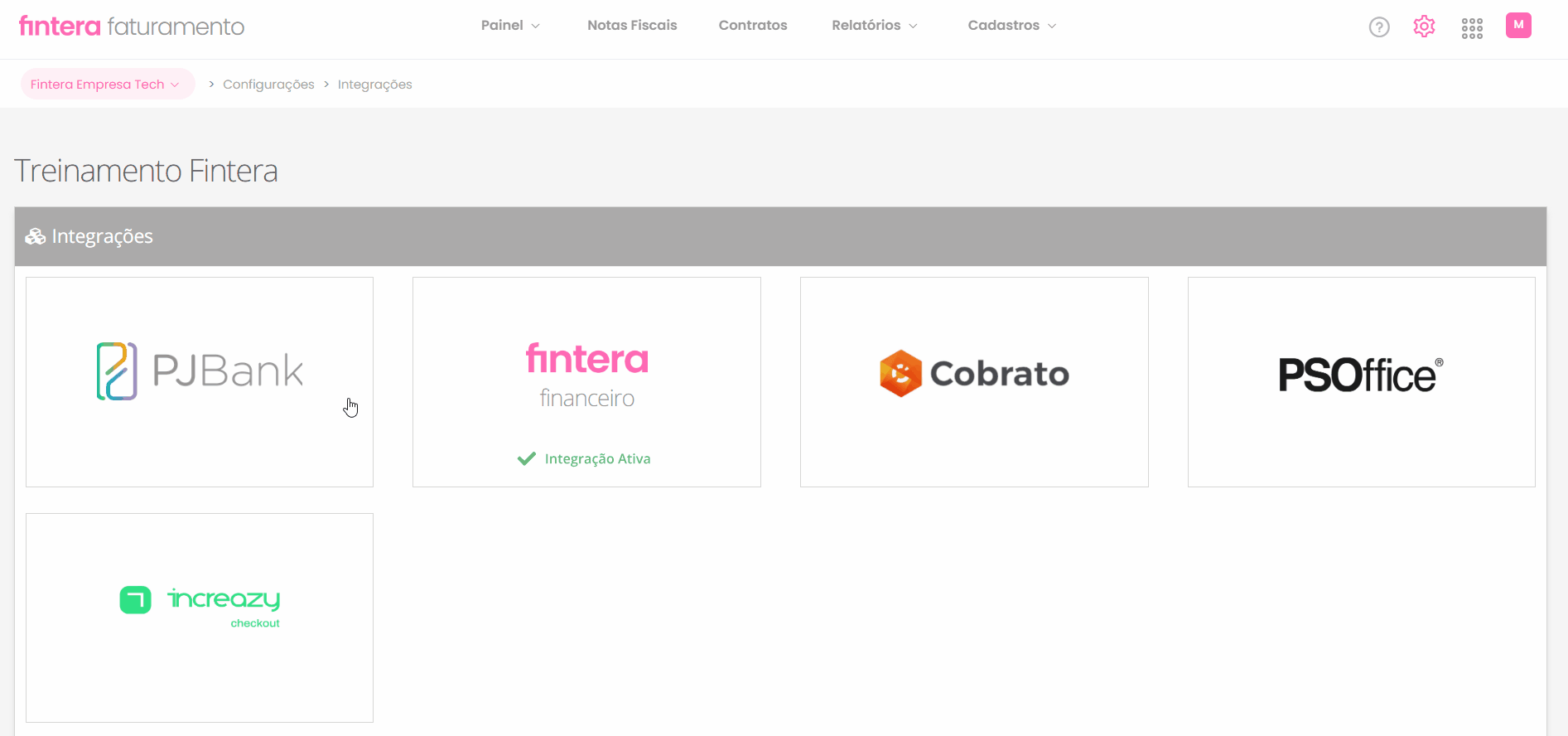 Na tela de Integrações, você verá os quadrantes de nossos parceiros disponíveis, como Fintera Financeiro (para gestão de contas e fluxo de caixa) e PS Office (para gestão de projetos).