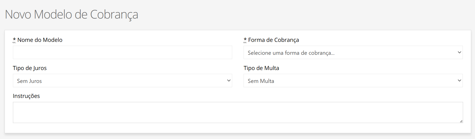 O Modelo de Cobrança é o local onde você define as políticas de cobrança que serão aplicadas aos seus clientes. Nele, você estabelece informações como regras de multas e juros para casos de inadimplência.