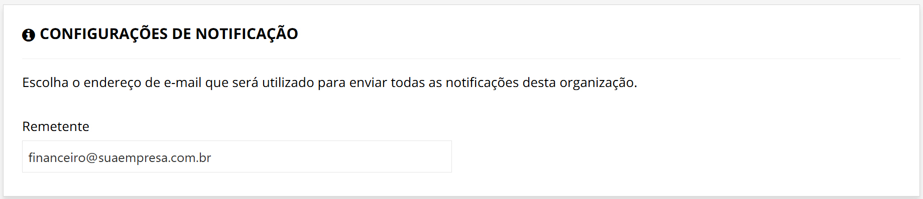 Na nova tela de Configurações de Notificação, você encontrará o campo Remetente. Digite o e-mail que você deseja que apareça para o seu cliente (ex: financeiro@suaempresa.com.br ). Este será o endereço responsável por encaminhar todas as notificações desta organização:
