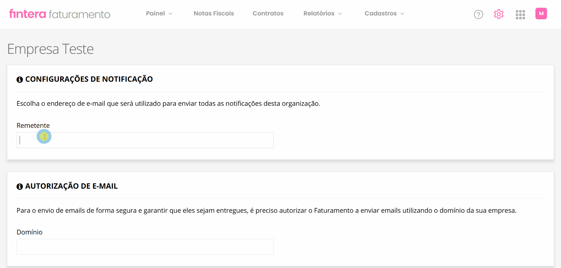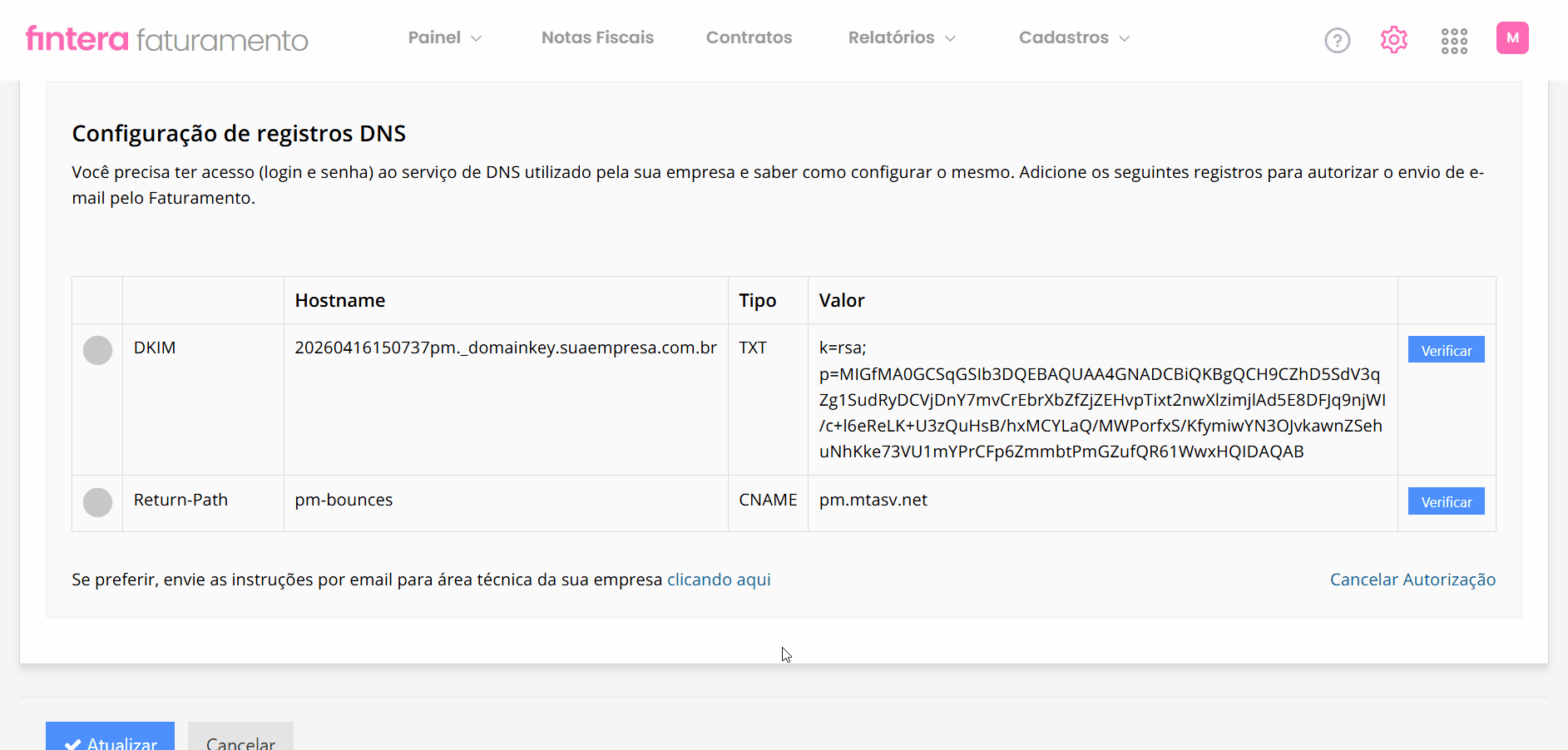 ℹ️ Importante: se você preferir não configurar um domínio próprio agora, não se preocupe. Suas notificações continuarão sendo enviadas automaticamente pelo e-mail padrão do sistema: notificacoes@fintera.com.br.
