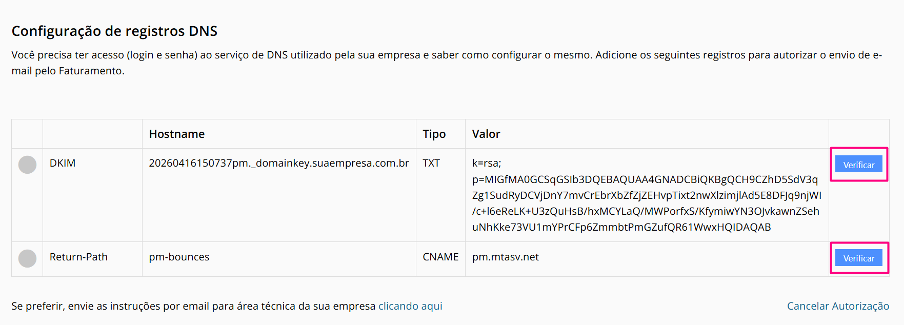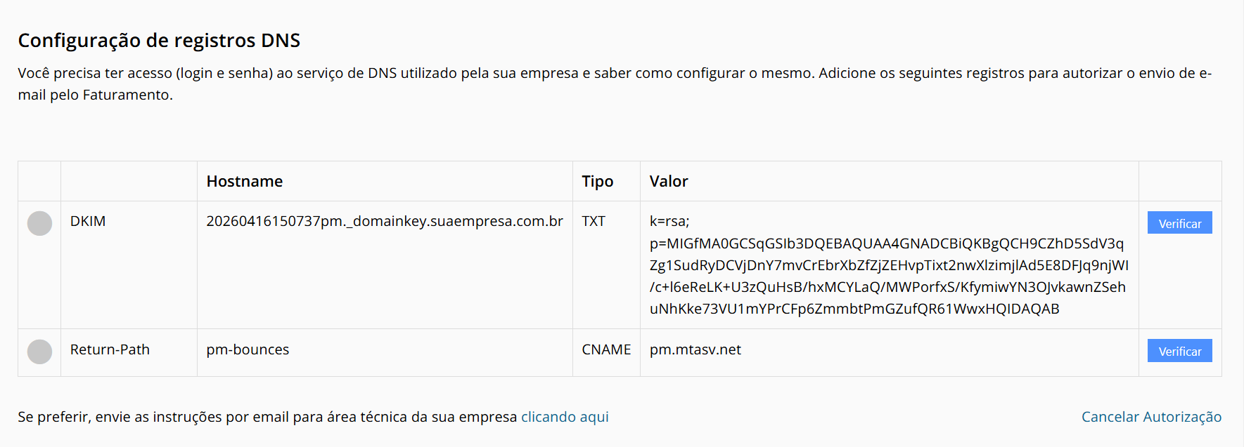 Esta é a etapa onde conectamos o sistema ao seu servidor de e-mail. A tabela exibirá dois registros essenciais, DKIM e Return-Path: