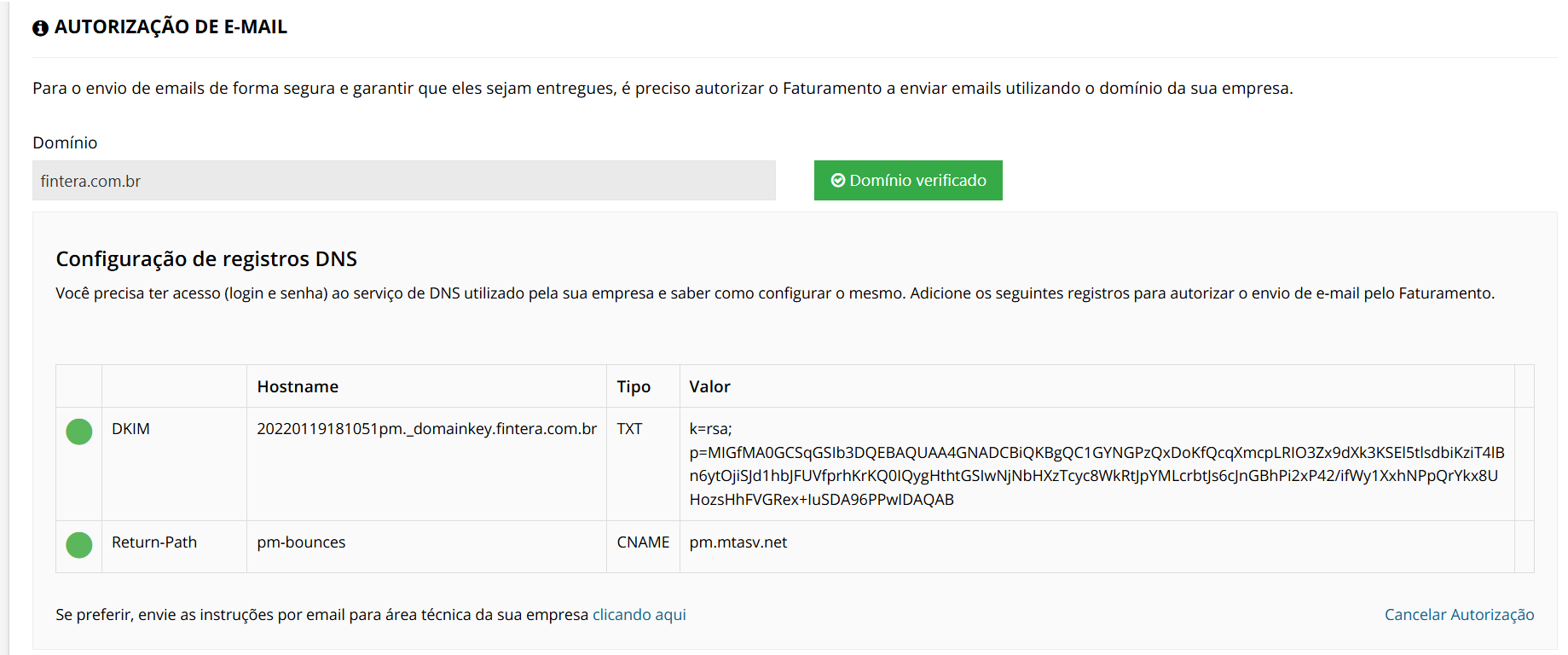 - Será exibida uma mensagem na parte superior da tela confirmando o sucesso da autorização e, em seguida, novas informações serão exibidas no quadrante Autorização de e-mail, com a exibição da tabela Configuração de registros DNS: