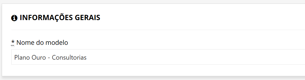 Neste campo, dê um nome claro ao seu modelo. Use descrições que ajudem sua equipe a identificá-lo rapidamente, como: “Contrato - Plano Ouro”, “Assinatura Mensal” ou “Consultoria”: