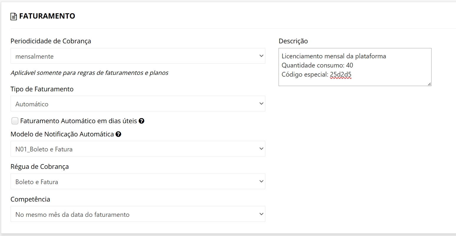 | Modelo de Notificação Automática | Este campo fica disponível apenas quando o tipo de faturamento é Automático. Escolha qual template de e-mail o cliente receberá, cadastrados anteriormente em Modelos de Notificação. |