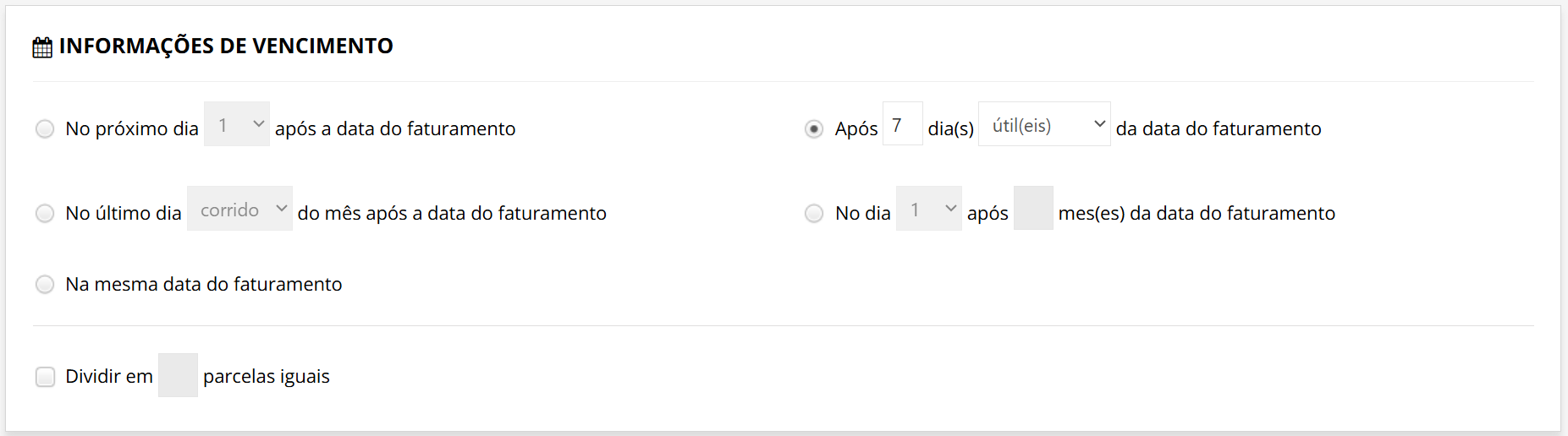 | Após [X] dia(s) [corrido(s)/útil(eis)] da data do faturamento | Permite uma contagem personalizada, diferenciando dias corridos de dias úteis (ex: "vencer 5 dias úteis após o faturamento"). |
