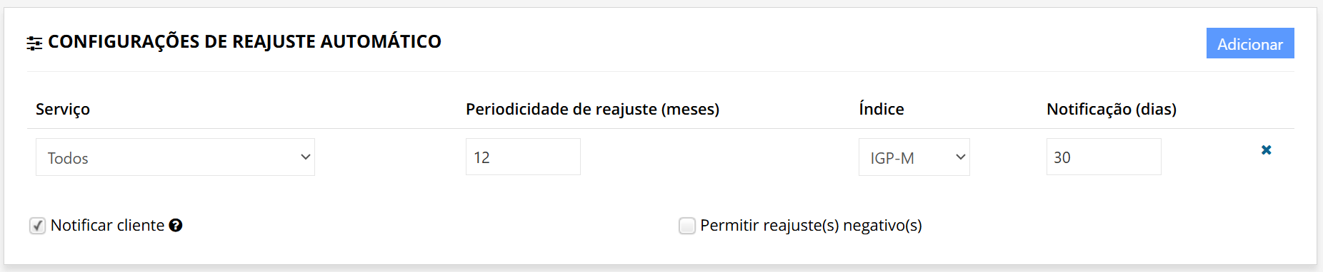 | Permitir reajuste(s) negativo(s) | Caso a alíquota acumulada do índice seja negativa no período, marque esta opção se desejar que o sistema diminua o valor do contrato. Se desmarcada, o sistema manterá o valor atual mesmo que o índice seja negativo. |