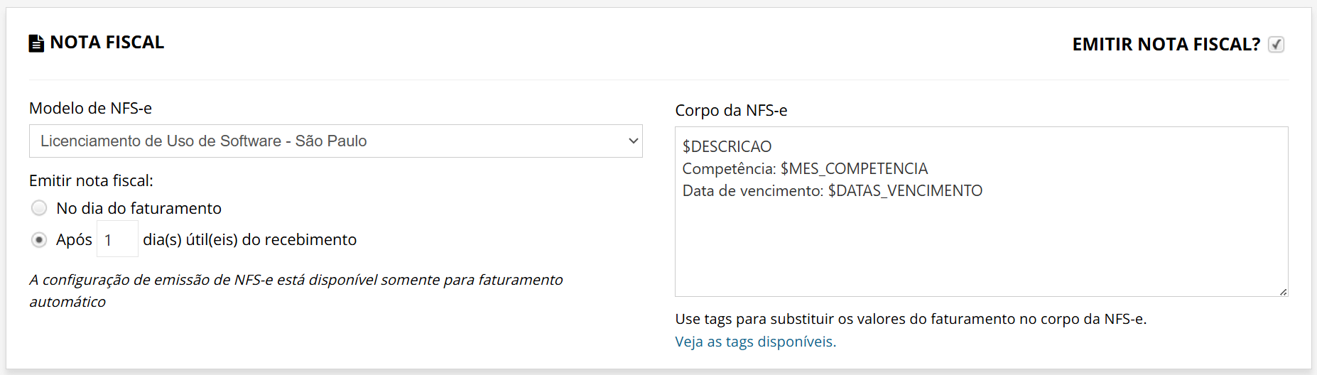 Este é o campo onde você personaliza o texto que aparecerá na descrição da nota. 💡 Dica: utilize as Tags de Substituição (como $DESCRICAO) para que o sistema preencha automaticamente os dados variáveis do contrato. Para conhecer todas as opções de automação de texto, clique em Veja tags disponíveis: |