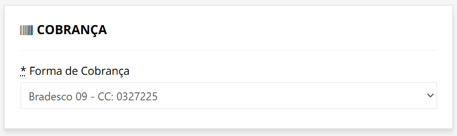 Nesta seção você define como o seu cliente deverá pagar pelo serviço. A lista de opções exibidas varia: se você tiver contratado e homologado a emissão de boletos, serão apresentados para seleção. Caso contrário, a opção exibida será apenas a de Transferência: