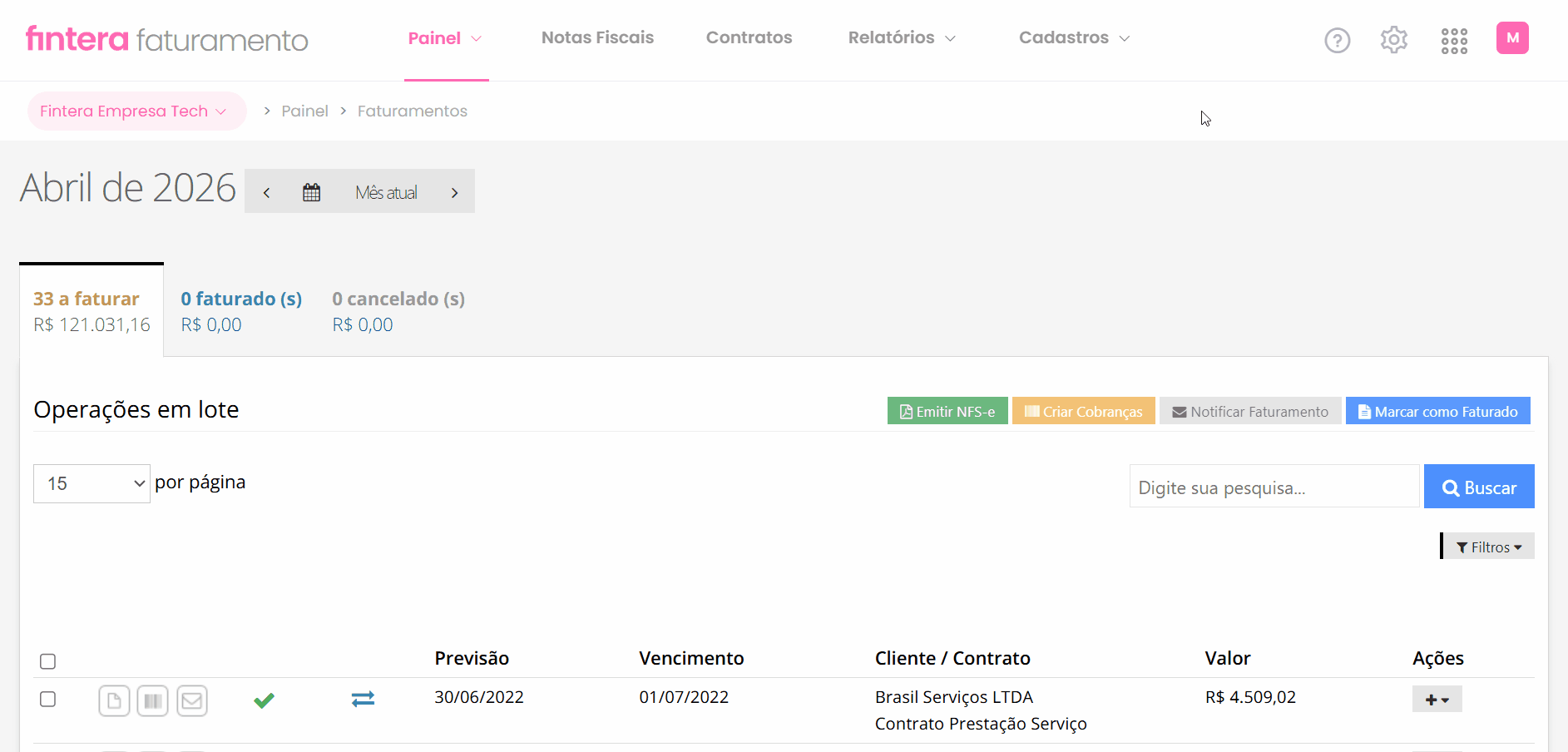| Valor bruto de cada faturamento | Localizado na barra azul inferior, este campo consolida a soma de todos os subtotais, apresentando o valor final total que será gerado em cada nota ou cobrança deste modelo. |