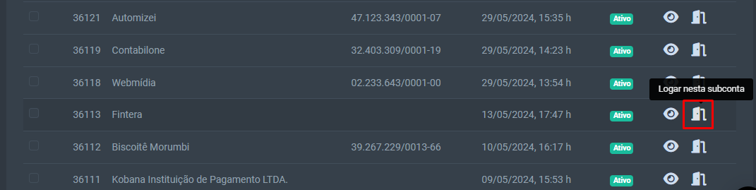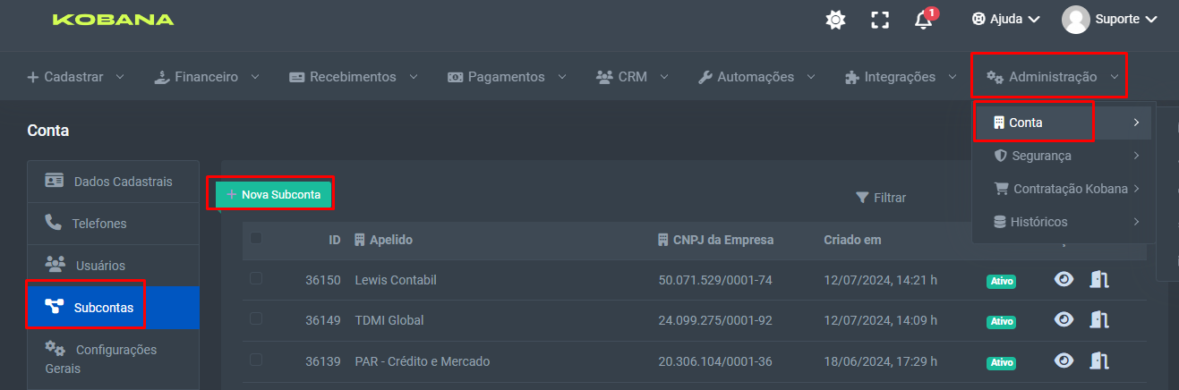 Isto é possível de se visualizar e realizar no menu Administração > Conta > Subconta: