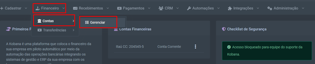 Em tela, clique sobre o menu Financeiro > Contas > Gerenciar: