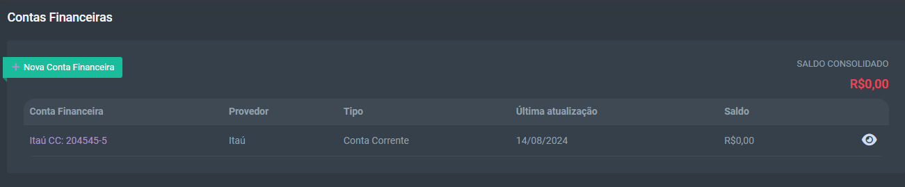 Em seguida, caso o cliente ainda não tenha um conta cadastrada clique em Nova Conta Financeira, ou caso já o possua é só clicar para Ver Conta Financeira: