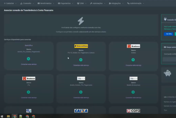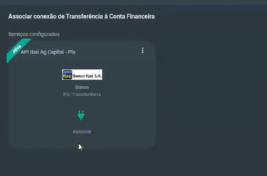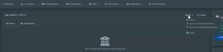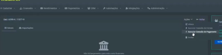 Retorne ao menu Financeiro > Contas > Gerenciar e acesse a Conta Financeira. Após clique em Ações > Associar Conexão de Pagamento: