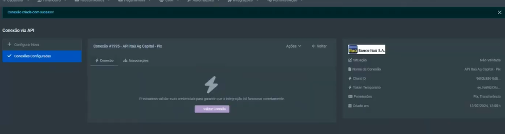 Após clique em Salvar que você será direcionado a tela de Conexão, nesta clique em Validar Conexão:
