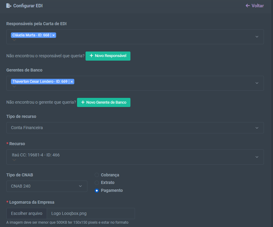 E após a confirmação de ativação da EDI, basta ativar as opções de boletos, ted e conta de consumo no staff e solicitar ao cliente que realize um teste de agendamento de pagamento de boleto ou TED.